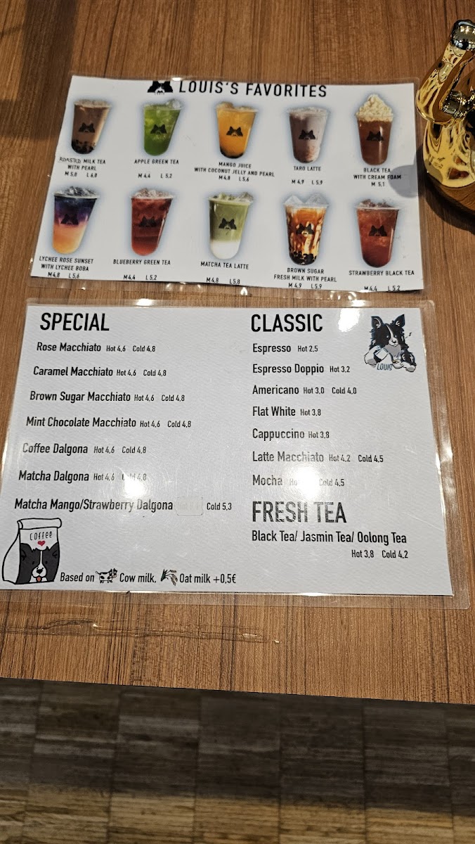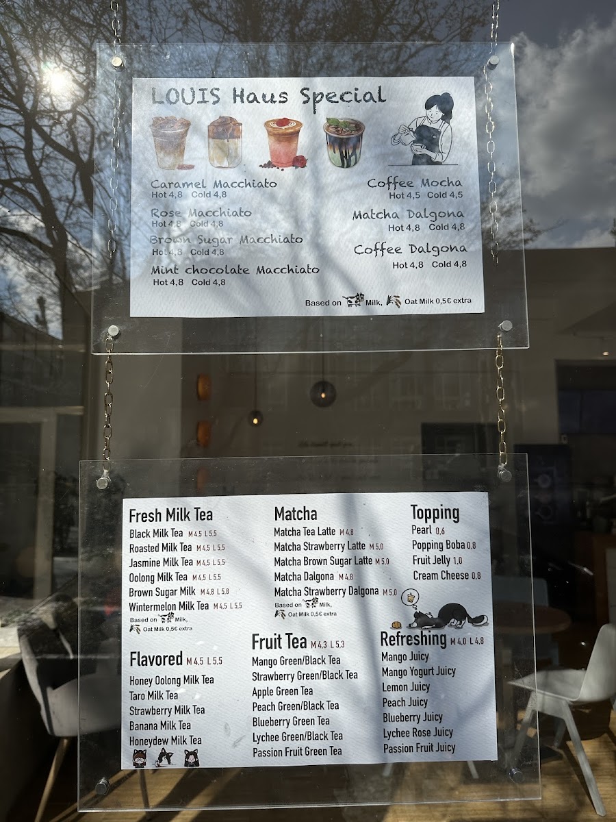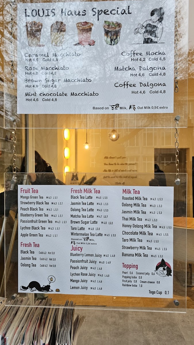 The menu at LOUIS Cafe am Dom features a variety of beverages and desserts primarily focused on café specialties and bubble tea. Visitors can expect a selection of bubble teas, including flavors such as Thai Bubble Tea, matcha-based drinks, and fruit-infused options. Coffee and tea offerings range from traditional brews like Café Americano and Jasmin Tea Latte to more specialty items such as Matcha Latte, Matcha Dalgona, Rose Macchiato, and Chocolat Macchiato.